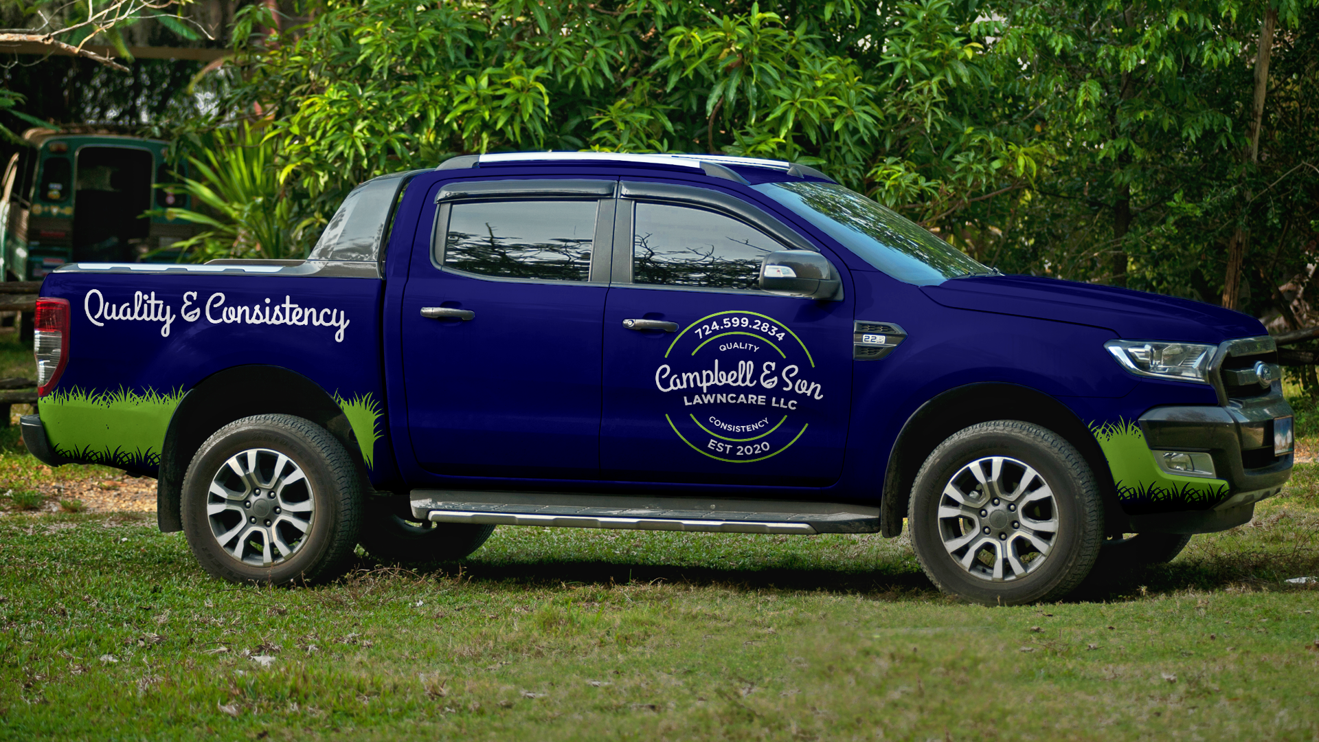 Since the truck was going to be a key advertising point for the company, a special badge decal was created for use on all Campbell & Son trucks. The badge includes the Campbell & Son wordmark as well as their tagline "Quality and Consistency," and the company phone number.
